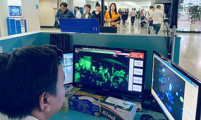 Kiểm tra nhiệt độ của hành khách nhập cảnh qua sân bay quốc tế Tân Sơn Nhất, TP.HCM. Ảnh: Duy Tính.